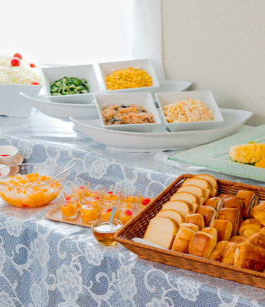 조식은 30종류 이상의 풍부한 메뉴를 매일 아침 제공. 특히 인기 있는 빵은 손님의 요청에 따라 상시 10종류 이상을 매일 배치합니다.